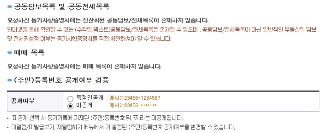 마지막으로 주민등록번호의 공개 여부를 설정하신 후 결제를 하시면, 부동산 등기부 등본 열람이 가능합니다. 결제 방법은 신용카드, 계좌이체, 휴대폰등으로 결제가 가능합니다.
