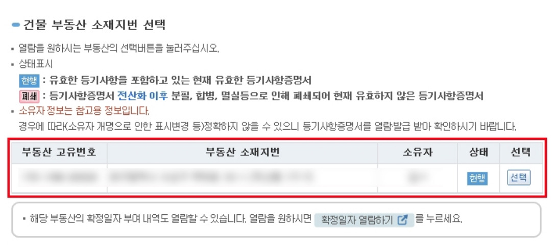 내가 검색하였던 부동산 고유번호, 부동산 소재 지번, 소유자에 대한 정보를 확인할 수 있습니다. 이전의 경우, 소유자의 전체 이름을 확인할 수 있었지만, 변경된 개인정보 강화에 의해서 성까지만 확인할 수 있도록 변경되었습니다.